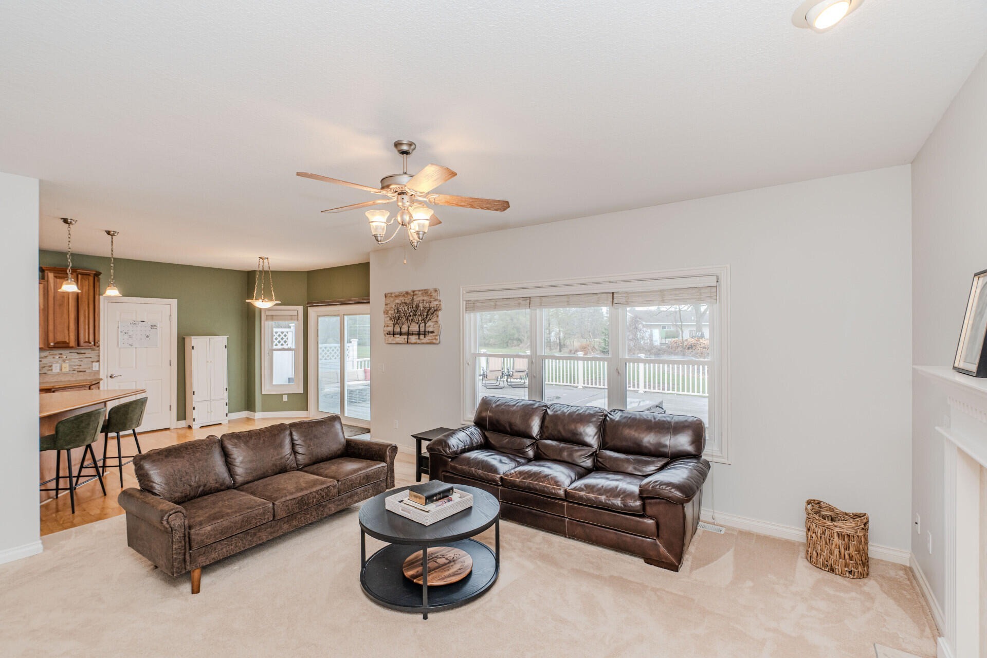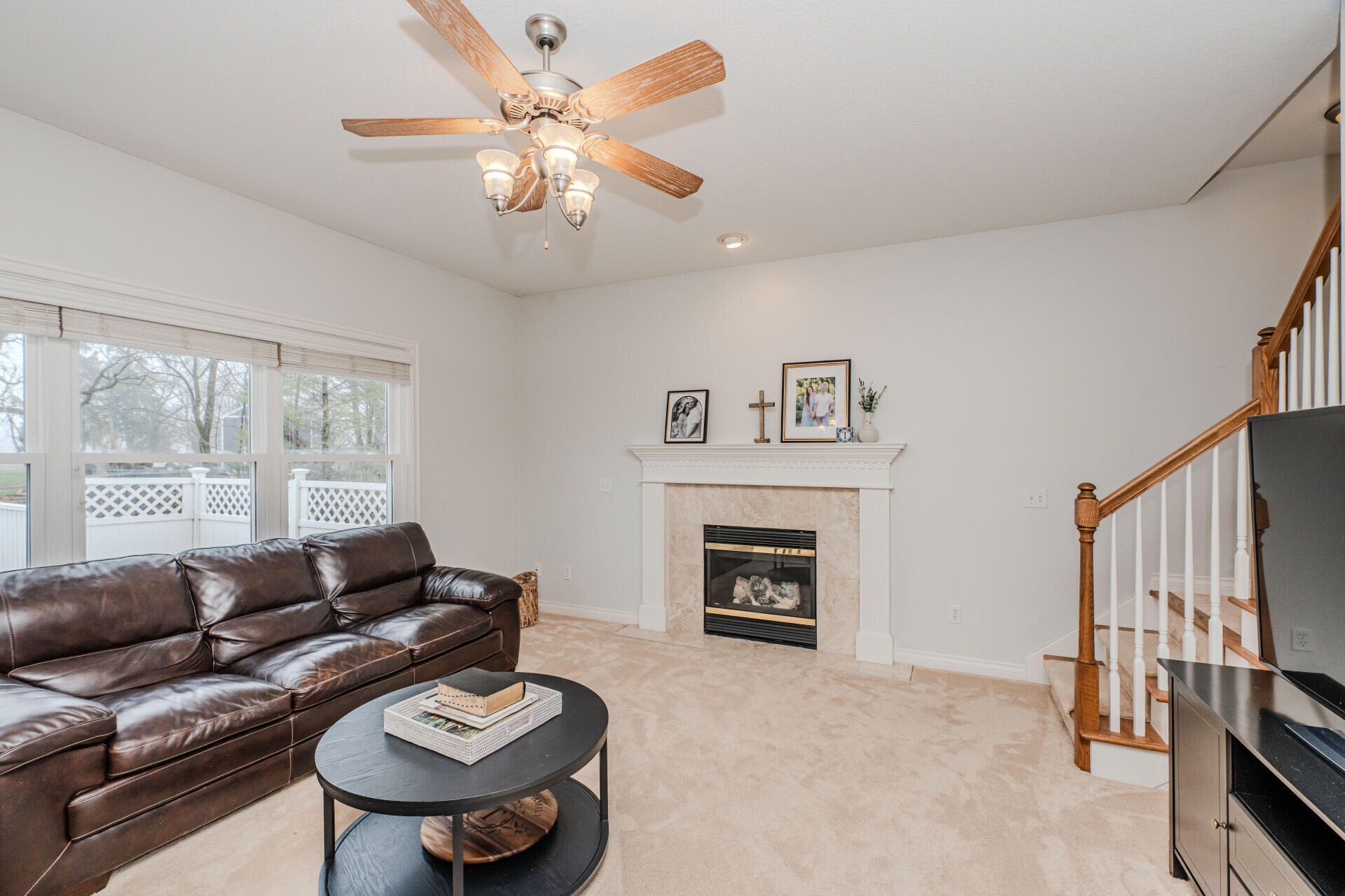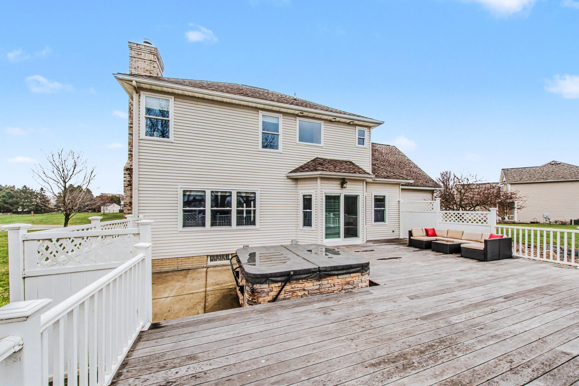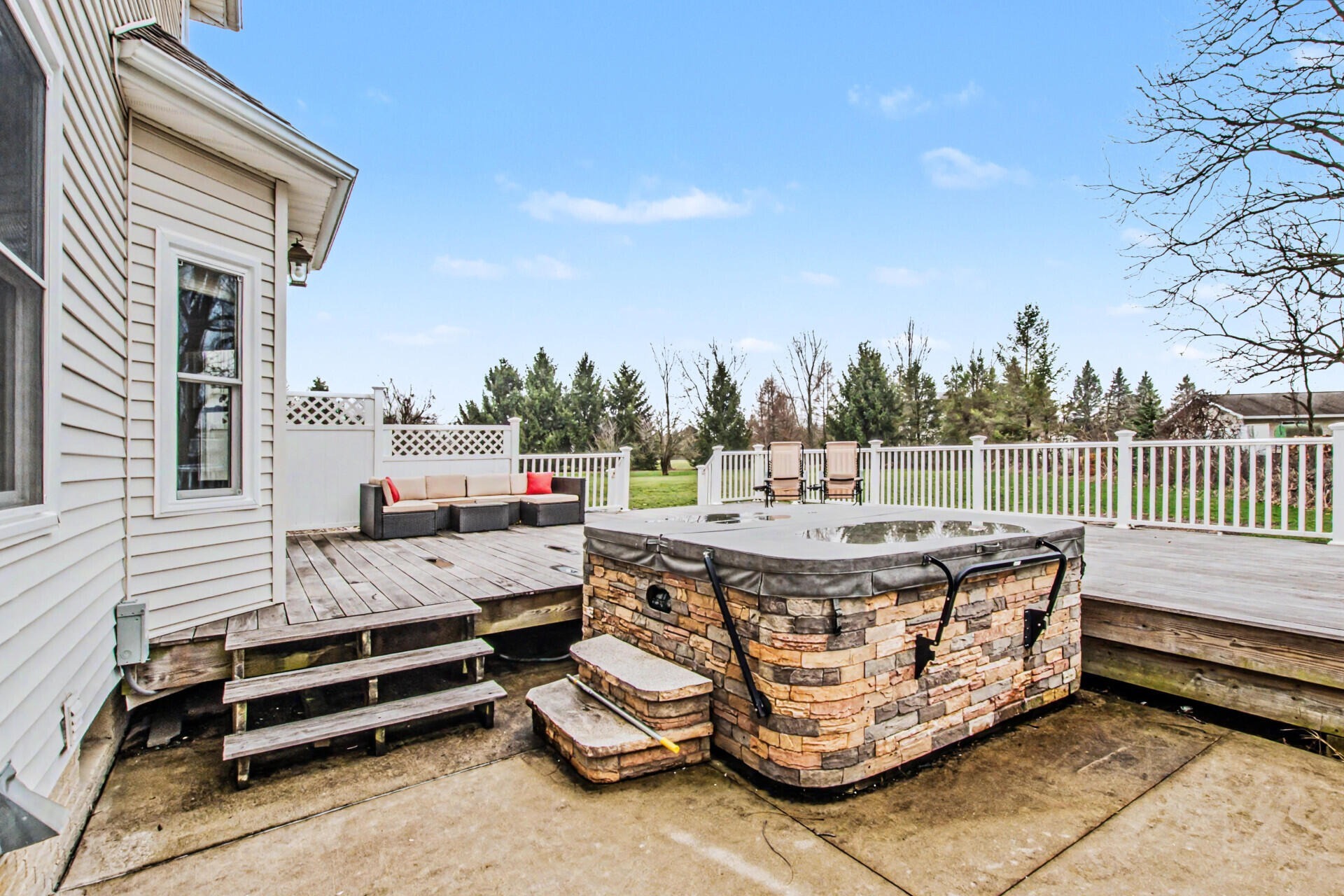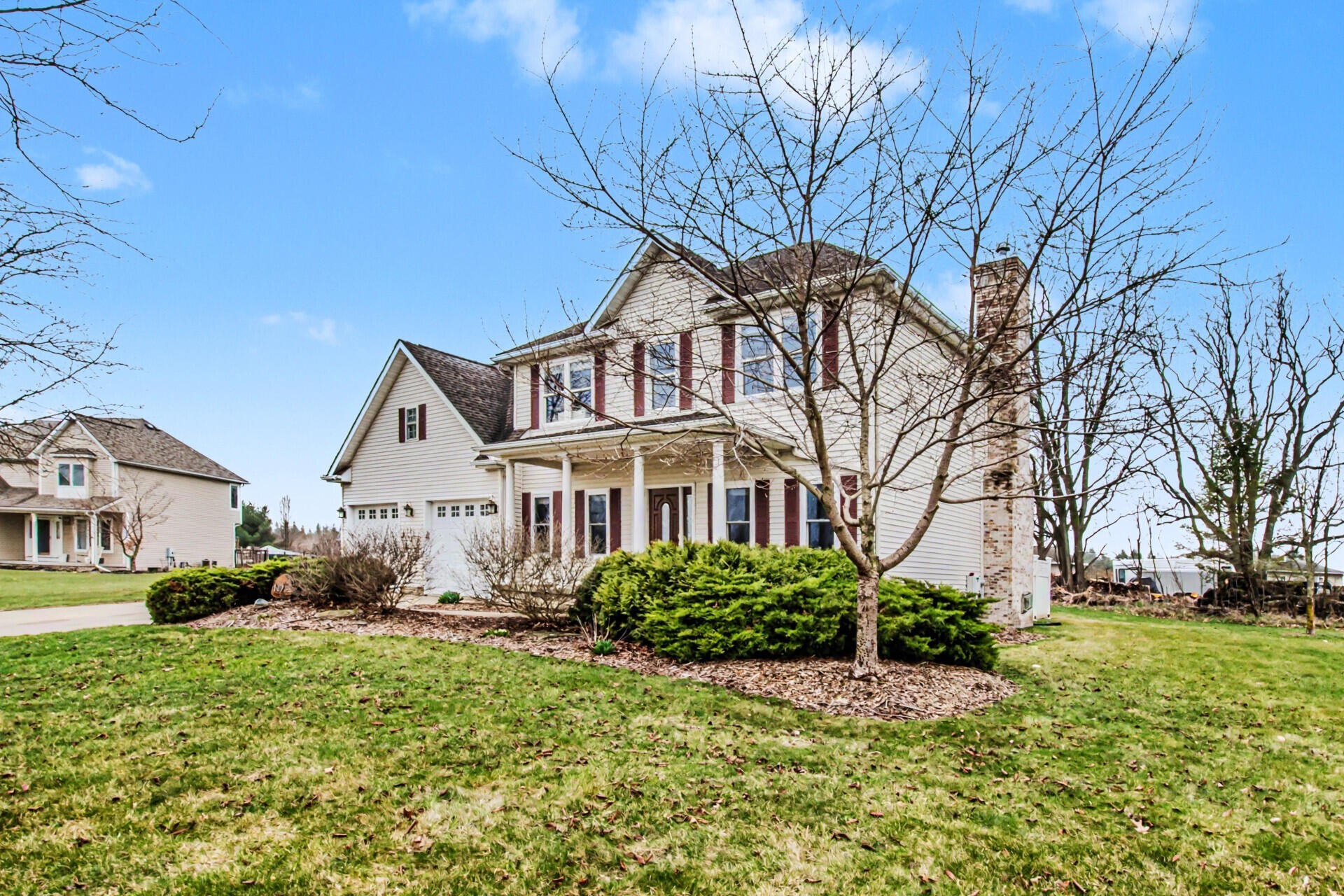 Welcome to this charming 3-bedroom, 2.5-bath colonial in Wolf Lake Highlands, set on a beautifully landscaped .93-acre lot in Grass Lake Township. A covered front porch and grand two-story marble foyer create a strong first impression, with arched entryways leading to a flexible front room, formal dining area, and a well-appointed kitchen featuring 42-inch maple cabinets, stainless steel appliances, and a peninsula overlooking the breakfast nook. The adjoining family room offers a gas fireplace and an easy flow for everyday living. Upstairs, the primary suite includes a tray ceiling, spa-like bath with soaking tub, separate shower, dual sinks, and generous closet space. Two additional bedrooms share a full bath, and brand-new Pella windows with a transferable warranty add peace of mind. The finished lower level expands your living space with a recreation room, second gas fireplace, workout area, workshop, and ample storage. Additional highlights include a first-floor laundry room, half bath, and 2.5-car attached garage. Step outside to a Brazilian hardwood deck, spacious backyard, and patio with a large hot tub—perfect for relaxing or entertaining.